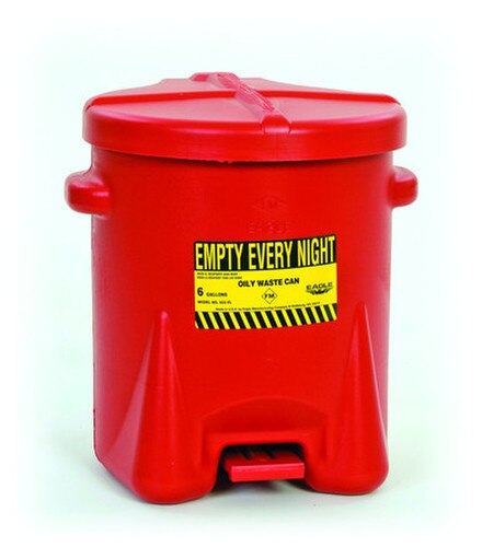 High-density cans provide fire safe temporary storage of solvents, waste rags, shavings and other materials subject to spontaneous combustion. Won't rust or dent. Resistant to most chemical compounds and features self-closing lid with foot lever. Red. FM approved. OSHA 29 CFR 1910.135(c)(4)(ii) and (iii) Compliant.