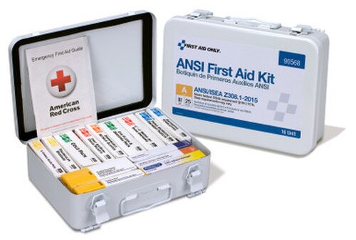 - Marketing Description - The 82-piece, 25-person, ANSI-compliant first aid kit holds all 18 ANSI required items and is designed for use in small offices, vehicles, and work sites. The case features a gasket and an easy-to-carry handle, yet is also wall-mountable for quick access in an emergency. Contents fit snuggly to prevent shifting, and single-use packaging ensures that products do not become contaminated.
