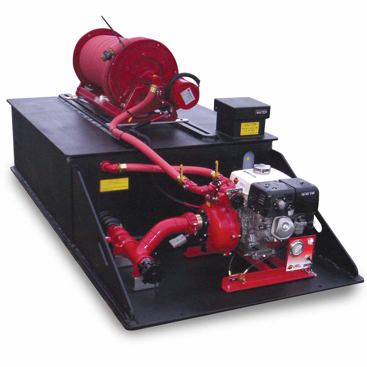 A tank, a live hose reel and/or crosslay, a portable fire pump and/or a compressed air foam system (CAFS), with an engine: these can be combined into a single one-piece assembly that can be slipped onto a truck bed, trailer, or into a body and used for flowing water and or foam on a structural fire, car fire or wildfire. The most common wildland and urban interface fire engines in North America combine a small truck with a water tank and a high performance portable pump. Municipal/industrial fire departments and all forestry fire authorities use drop-in units. The sizes vary from 50 gallons, for an ATV, up to 500 gallons for full size trucks.
