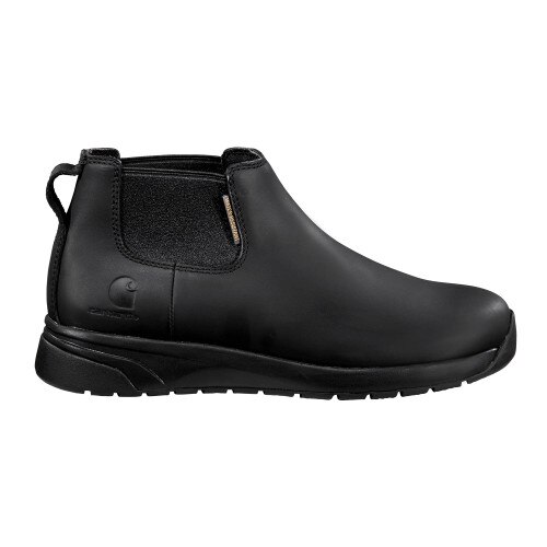 Be ready for the workday in the durable Carhartt® Force water resistant 4" Romeo Nano Toe Station Boot. Featuring a slip-on style with elastic gore panels, a round toe silhouette and pull tab in back.
