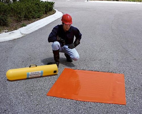 Made of reinforced mesh "sandwiched" between layers of polyurethane for durability and resistance to tearing. Unique urethane construction allows the pad to deform and seal off most drains with smooth surfaces. Unlike some alternative products, both sides will quickly seal drains - there is no specified "top" or "bottom". Optional wall-mounted units allow quick response to any spill - just "grab and go"! Flexible, non-absorbing material with reinforced, tear-resistant mesh. Resists oil, water and most aggressive chemicals. Cleans with soap and water. Standard color orange.