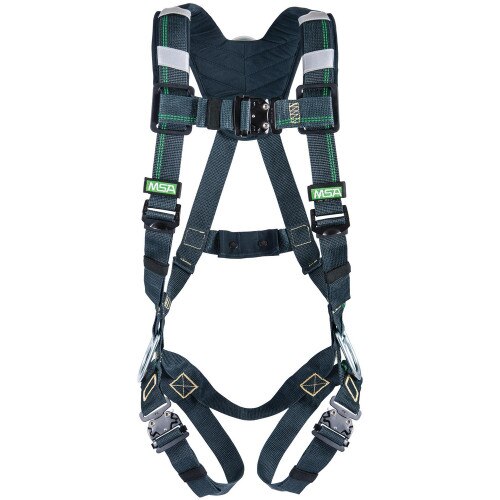 The MSA body harness is made of stamped/forged alloy steel and is packaged 1 per case. Proper sizing is important when buying this part. The size for this product is XL. For proper security and safety, this body harness offers a maximum working load of 400 lb.