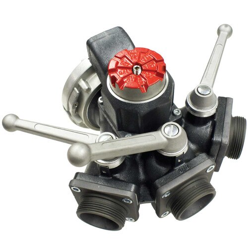 Mid-size, light weight 3 way LDH ball valve feeds three smaller lines from one LDH line or feed one LDH line from up to three smaller lines. The balls are hard anodized with stainless steel tappets for corrosion resistance. Valve includes a field adjustable pressure relief valve. Specify the size of Storz or NST connections.