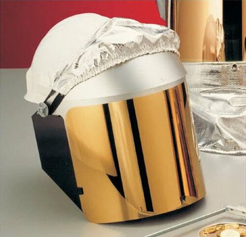 Clear 8″ x 14″ x 0.100″ molded polycarbonate shield with a reflective layer of 24 karat gold protected by a scratch-resistant coating on the outer surface and an anti-fog coating on the inner surface.