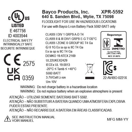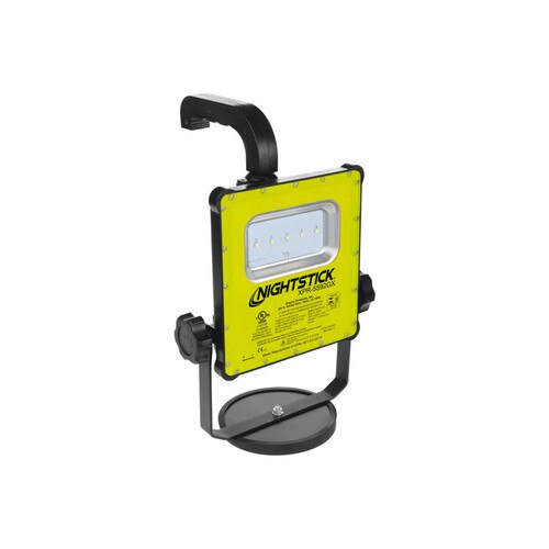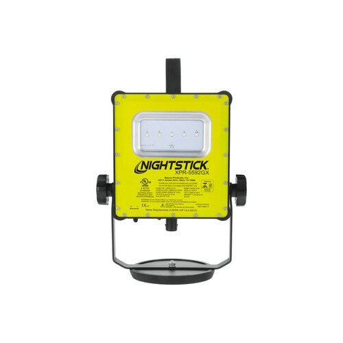 The XPR-5592GCX Rechargeable LED Scene Light Kit is ideal for use when portability is important. Zone 0, cULus, ATEX, IECEx, and InMetro certified Intrinsically safe for use in hazardous environments, the array of 5 floodlight LEDs perfectly emits an impressive 1,200 lumens on high for 6 hours, or 650 lumens on low for 12 hours when activated using the robust three-position toggle switch. This scene light has a housing that is constructed from lightweight glass-filled nylon polymer keeping it cool to the touch while being chemical, heat, and impact resistant. A heavy-duty rare-earth magnetic base is securely mounted on the bottom to provide 360 degrees of hands-free rotation for proper light placement on any job site. Powered by an integrated lithium-ion battery, this scene light kit includes an adjustable steel handle for carrying or hanging, a 6-foot tripod with Camlock adjusters, and both AC/DC power supplies placed inside a durable blow-molded carrying case for ease of use and storage.