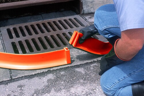 Temporary berm seals off spills from the environment, nearby drains and doorways. Standard 10' sections can be cut to various lengths to meet custom needs. Urethane material "weeps" into small cracks and crevices to seal off liquid flow. Flexible berm will bend and turn to form almost any shape while temporarily "bonding" to any smooth surface. Non-absorbing and is easily cleaned for repeated use. Optional corner sections and connectors can be used to create 90° angles.